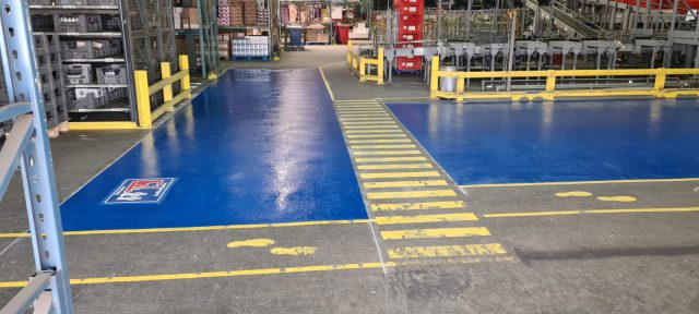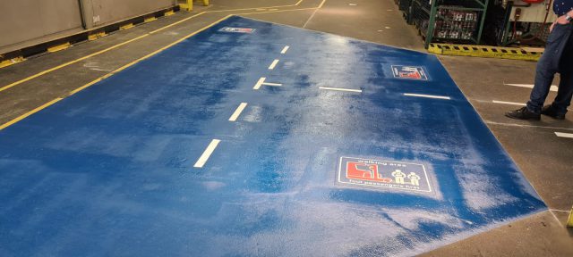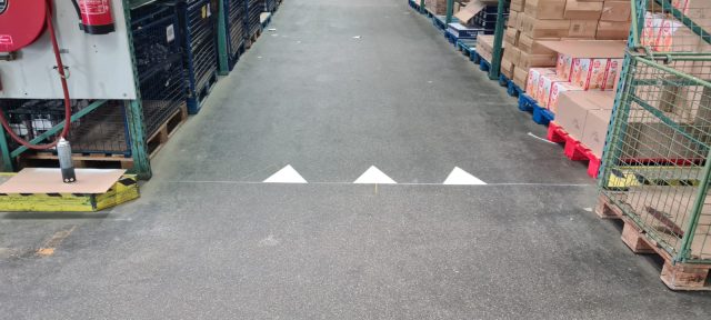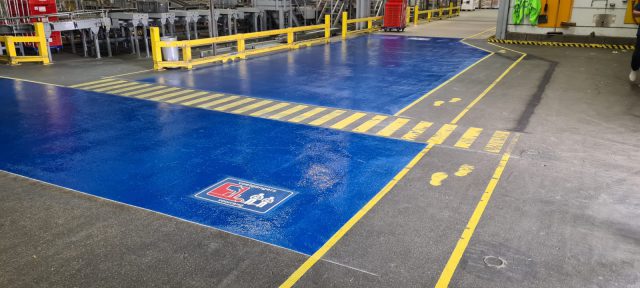 We brachten meer dan 150 m² blauwe markering aan voor onze opdrachtgever. Daarnaast hebben wij de fabriekshal voorzien van bewijzering in de vorm van strepen en pijlen. Voor de markeringen hebben wij onze 2-componenten verf gebruikt en een aantal prefab symbolen.